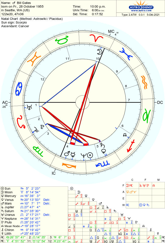 Bill Gates was born under a late Cancer Ascendant so Saturn (Capricorn) rules his perception of the world. This itself shows someone who is oriented towards their values, emotions and needs and wants to protect their inner vision from the hard and difficult outer world. This person sees the world as a place to be impacted by his own personal vision because Saturn is in Scorpio in the 5th house. Bill therefore is oriented inwards in order to transform (Scorpio) the world (Saturn) with his creative vision (5th house). Bill’s chart ruler the Moon is in the sign of Aries in the 10th house. Mars ruler of his Moon is in the fourth house together with Mercury which indicates a lot of inner introspection about ideas that form his need to act (Mars). We can also note Bill’s Sun is conjunct Neptune but square Uranus on his ascendant. He may be very good at knowing what other people need and want but his inner self stays hidden/private.