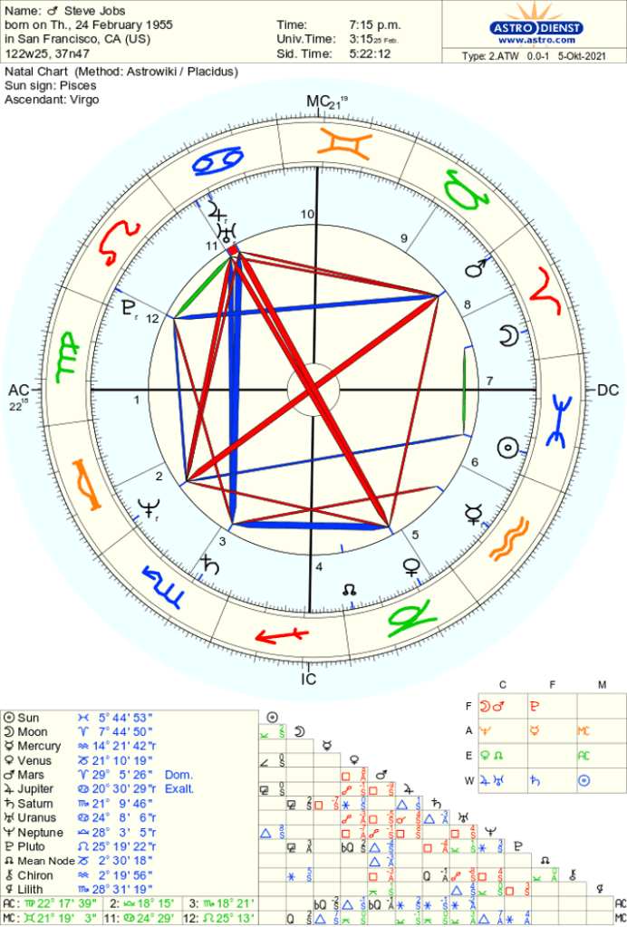 Let us try another example: Steve Jobs. Is he an introvert or an extrovert? Jobs is a Virgo ascendant so already my prior example of extroverted orientation towards the world applies. His Mercury is in Aquarius in the 5th house which shows a strong tendency towards social self-expression- a person who wants to play the eccentric in the group and be noticed (Leo rules the 5th house). He has a rather weak Aries Moon the 7thhouse so once again very inclined towards taking action towards people or towards leading people. The ruler of his 5th house is conjunct Uranus and in the very public 10 house.